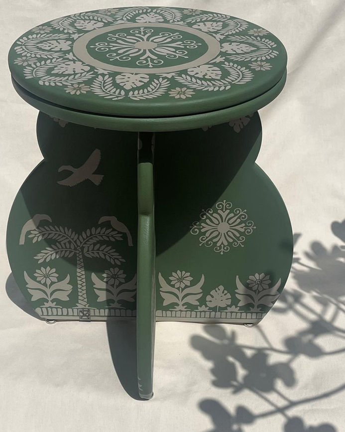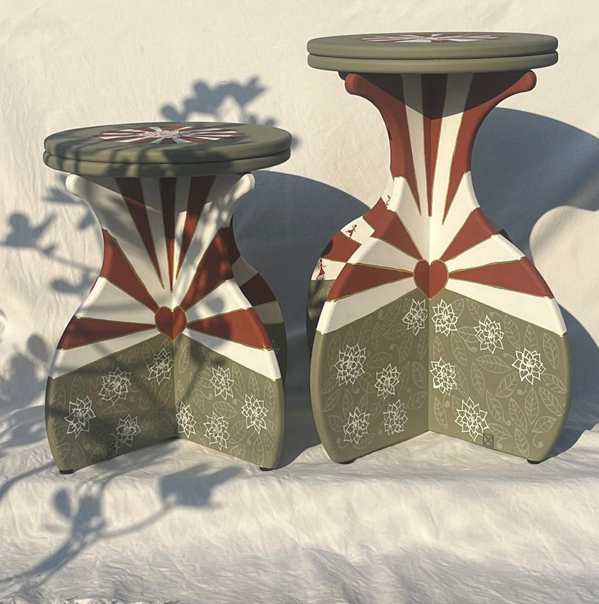 Design autoral exclusivo e patenteado, todos os banquinhos, cores e pinturas foram feitas à mão com tinta acrílica sobre painel de fibra de madeira prensada de alta resistência e durabilidade.